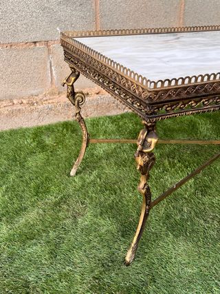 MESA ORIGINAL REALIZADA EN BRONCE DORADO Y MÁRMOL NATURAL, DE ESTILO LUIS XVI. LA TAPA ES DE MÁRMOL AUTÉNTICO. ESTRUCTURA COMPLETA DE BRONCE DORADO, CON UN TRABAJO ARTESANAL MUY DETALLADO. CUENTA CON PATAS CURVAS DECORADAS, CON FIGURAS HUMANAS CLÁSICAS EN RELIEVE EN LAS ESQUINAS, DE INSPIRACIÓN GRECORROMANA. NO ES UNA MESA CORRIENTE NI DE PRODUCCIÓN ACTUAL, SINO UNA PIEZA DECORATIVA DE ESTILO CLÁSICO, PENSADA PARA INTERIORES CUIDADOS. MESA SÓLIDA Y BIEN CONSTRUIDA IDEAL COMO MESA DE CENTRO O MESA AUXILIAR. Antigüedades oro vintage clásico retro arte figura joya barroco muebles museo plata latón vajilla marfil Ikea pieza