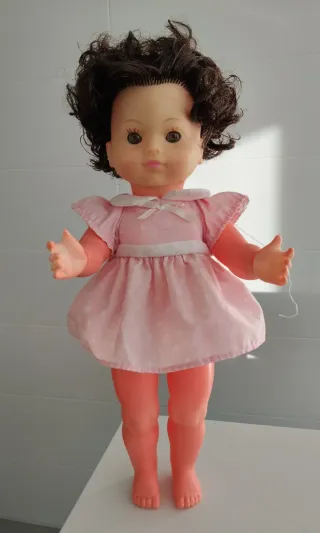 Muñeca antigua, cuerpo de plástico, cabeza de goma descolorida, muñecas móviles, ojos durmientes.40 cm de altura. Tiene el pelo con algo de pegamento.
