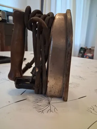 Plancha eléctrica antigua con un diseño clásico y un cable para su conexión. - Mango de madera. - Base metálica.