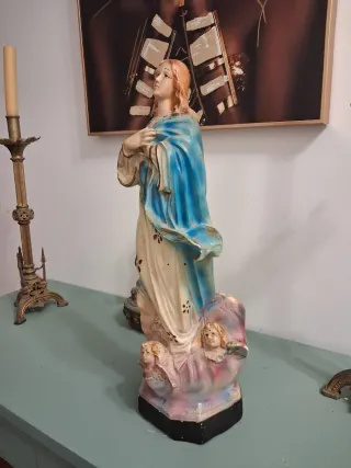 Figura religiosa de la Virgen Inmaculada con más de 50 años de antigüedad. Representa a la Virgen sobre nubes con ángeles a sus pies. - Detalle de túnica azul y blanca. - Base con querubines. - Pintura con toques dorados.