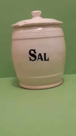 Antiguo salero de cerámica blanca con la inscripción SAL en color azul, el paso de los años ha dejado su huella. - Diseño clásico y funcional. - Acabado brillante. - 1930's - 13 cm altura, 9 cm boca.