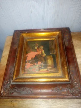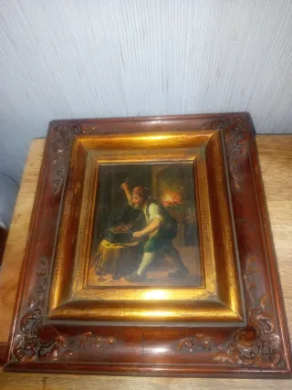 Pequeño cuadro antiguo con marco de madera tallada y detalles dorados. Representa una escena de forja con un joven trabajando. - Marco de madera con ornamentación. - Pintura con escena interior. - Colgante incluido.