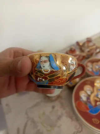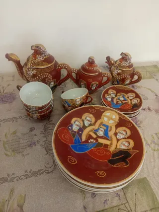 Precioso juego de té antiguo de Satsuma, con un diseño detallado y colores vibrantes. - Incluye tetera, azucarero y tazas. - Decoración con motivos dorados y figuras. - Piezas de cerámica de alta calidad.