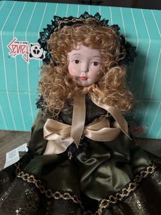 Preciosa muñeca de porcelana con un elegante vestido. Perfecto estado de conservación. Sin estrenar - Vestido de satén verde con detalles en encaje negro y dorado. - Lazo grande en la parte delantera. - Cabello rubio rizado. - Adornos de encaje negro en la cabeza.