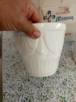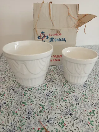Bonita pareja de maceteros antiguos de cerámica de Manises. - Fabricados en España. - Diseño con relieve. - Color blanco.,vienen 2 en la caja original de el Manises de la casa montesa