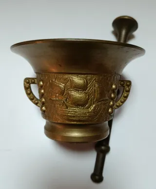 Vendo por 35€, mortero antiguo de bronce con mazo. Tiene asas laterales, los Reyes Católicos y una de sus carabelas en relieve. Sus medidas son: Altura de cuenco, 7 cm. Diámetro de la boca del cuenco, 12 cm. Diámetro de la base del cuenco, 6 cm. Largo del mazo, 19 cm.