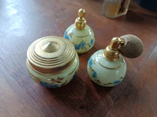 Conjunto de tocador antiguo de cristal con un delicado diseño floral. - Tarro con tapa dorada. - Dos frascos con atomizador. - Decoración de flores azules y doradas.