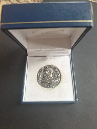 Medalla de plata con un diseño detallado. - Presentada en una caja de presentación azul.
