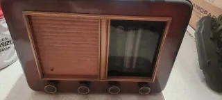 Radio antigua de madera con su transformador. - Diseño clásico. - Frontal con rejilla de altavoz y dial. - Mandos giratorios en la parte inferior.