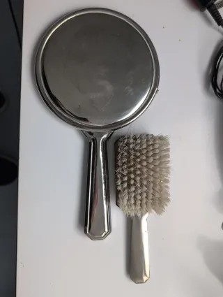 Conjunto de tocador vintage de los años 60, compuesto por un espejo de mano y un cepillo. - Diseño clásico y elegante. - Acabado metálico plateado.
