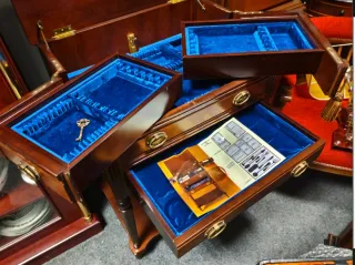Elegante mueble para cubertería con un diseño clásico. -2 llaves. - Fabricado en madera de alta calidad. - Interior forrado en suave terciopelo azul. - Incluye un pequeño detalle decorativo en forma de llave.