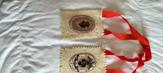 Antiguo escapulario de fieltro rectangular con dos medallones cosidos en el centro y cintas rojas para colgar. Uno de los medallones pone junio de 1877 Borde festoneado. Los fieltros miden 12 x 8 cm. Están picados por polilla . Se ve en las fotos. Los medallones están perfectos.