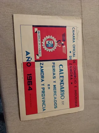 Calendario de ferias y mercados de la Cámara Oficial de Comercio e Industria de Zamora y Provincia del año 1964. Medidas: 32cm x 22cm - Portada con diseño retro. - Incluye el escudo oficial de la Cámara. - Texto en español.