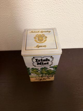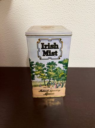 Esta es una lata antigua de Irish Mist Liqueur, con un diseño que evoca un paisaje campestre con personas paseando. - Lata de colección. - Diseño vintage. - Ideal para coleccionistas de licores o artículos decorativos.