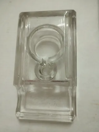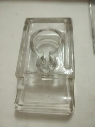 Este es un tintero antiguo fabricado en cristal transparente. Su diseño es rectangular con un soporte circular en la parte superior. - Material: Cristal. - Color: Transparente. - Forma: Rectangular con soporte circular y espacio para pluma