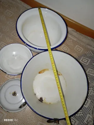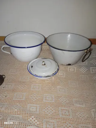 Conjunto de piezas de porcelana esmaltada vintage. - Barreño con asa. - Orinal - Caneco con tapadera. Orinal buen estado. Resto de piezas con signos evidentes de uso y paso del tiempo Escucho ofertas por todo o algún objeto suelto.