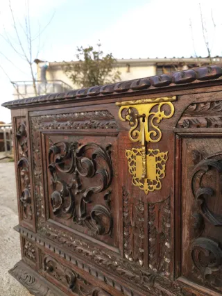 Arca antigua de madera de castaño con intrincados tallados y detalles. - Herrajes de bronce. - Diseño clásico y ornamentado. Medidas: 105 x 45 x 70