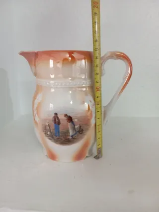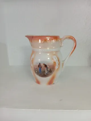Preciosa jarrita antigua con un diseño pintado a mano. Su acabado nacarado le da un toque especial. - Escena pintada con figuras. - Borde decorativo con relieve. - Asa con detalles en naranja.