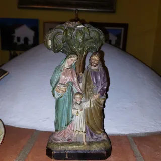 Figura de la Sagrada Familia de Olot, primera fase. Arte. Edición de la 1a. Fase. Olot. Alta calidad, sin restaurar. Las piezas de la primera fase son codiciadas y raras. Altura: 30 cm. Posteriormente se hicieron nuevas series pero estilisticamente eran en serie, aquí se conserva los rostros del escultor ... - Representación de la Sagrada Familia. - Detalle de árbol en la parte superior.