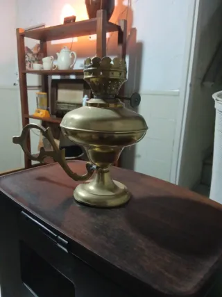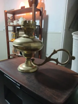 Antiguo quinqué de latón con un diseño clásico y elegante. Ideal para coleccionistas o como pieza decorativa. - Material: Latón - Estilo: Antiguo - Color: Dorado