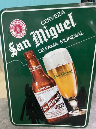 Vendo cartel publicitario original de cerveza San Miguel, ideal para decoración de bares, bodegas, garajes, locales comerciales o coleccionistas de memorabilia cervecera. Características: • Marca: San Miguel • Diseño clásico con botella y copa de cerveza • Material: metal rígido • Uso: decoración vintage / retro • Estado: usado, con señales normales del paso del tiempo (ver fotos), lo que le da un atractivo auténtico • Se puede colgar o apoyar Un cartel muy vistoso y decorativo, perfecto para dar un toque clásico y cervecero a cualquier espacio. Precio negociable.