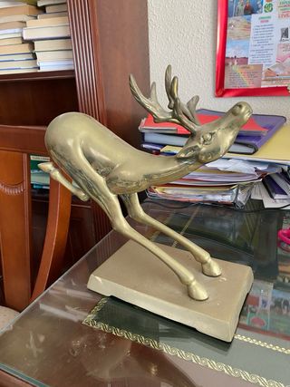 Vendo elegante figura decorativa de ciervo, realizada en material sólido con acabado dorado envejecido, montada sobre base rectangular. Diseño estilizado y moderno, ideal para decoración de salón, despacho, estantería o vitrina. Se encuentra en buen estado general, con leves marcas propias del uso y del paso del tiempo (visibles en las fotos), que no afectan a su estabilidad ni a su estética. Características: • Figura decorativa de ciervo • Color dorado • Base incluida • Estilo moderno / clásico decorativo • Pieza estable y resistente