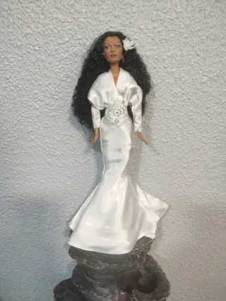 Muñeca Barbie Dayana Rose con un elegante vestido blanco satinado, nunca jugada siempre expuesta - Vestido largo con detalles plateados en la cintura. - Mangas abullonadas y escote en V. - Adorno floral en el cabello.