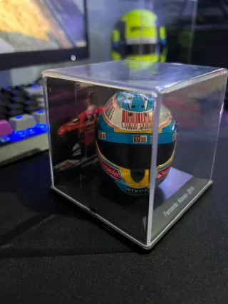 Réplica a escala 1/5 del casco de Fernando Alonso de la temporada 2013, utilizado en el Gran Premio de Mónaco. - Diseño detallado del casco. - Base expositora incluida con el nombre del piloto y el año. Precio No negociable. Pago por bizum.