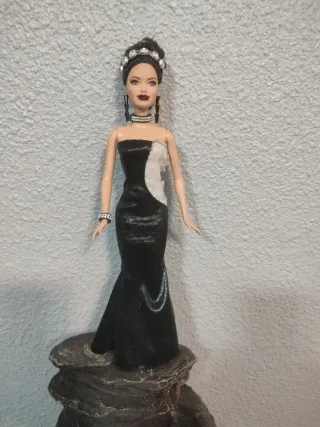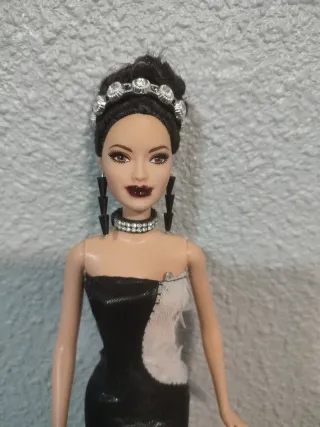 Muñeca Barbie con un elegante vestido. - Vestido bicolor negro y blanco. - Adornos plateados en la cabeza y cuello, pulsera zapatos. - Pendientes largos negros, regalo 🎁 pendientes adicionales de cristalitos con esta compra 🛍️.
