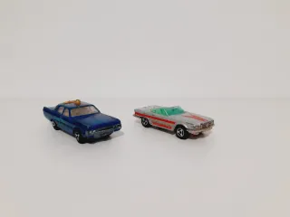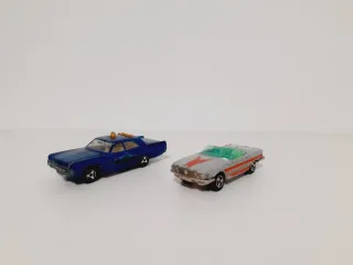 Dos coches de juguete clásicos de la marca Majorette. Un coche de policía azul y un deportivo descapotable gris. - Precio por los dos - Coche de policía azul con detalles. - Deportivo descapotable gris con detalles rojos y parabrisas verde.
