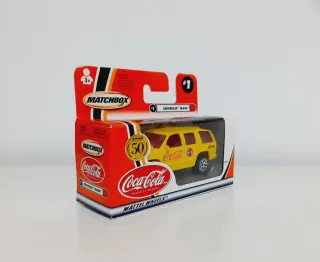 Vehículo de colección Matchbox Chevrolet Tahoe con temática de Coca-Cola. - En caja original sin abrir - Modelo especial por el 50 aniversario de Matchbox (1953-2003). - Color amarillo brillante con logotipos de Coca-Cola. - Escala 1:64.