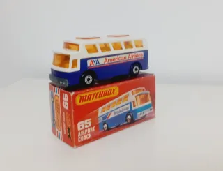 Autobús de juguete Matchbox, modelo Airport Coach. - En caja original - Diseño clásico de autobús de aeropuerto. - Color azul y blanco con detalles naranjas.