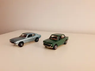 Se venden dos coches de juguete clásicos, un Ford Capri y un BMW 2002, ambos de la marca Matchbox. - Ford Capri de color azul metálico. - BMW 2002 de color verde.