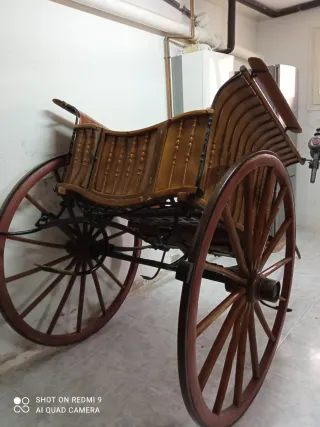 Carro de caballos antiguo, con un diseño clásico y elegante. Ideal para coleccionistas o eventos. - Estructura de madera. - Asientos de cuero. - Ruedas de madera con radios. - Mecanismo de hierro.