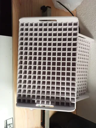 Práctico organizador para rotuladores o material de manualidades. Con múltiples compartimentos para mantener todo ordenado. - Diseño de rejilla. - Color blanco. - Asas para facilitar el transporte. - 204 ranuras en cada organizador 2 montados y 2 nuevos en su caja