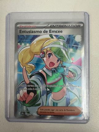 Carta de Entrenador Entusiasmo de Emcee del juego de cartas. - Tipo: Partidario - Ilustración: Conia Nifundo - Número de carta: 220/182