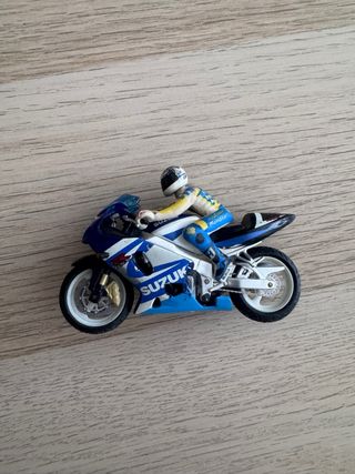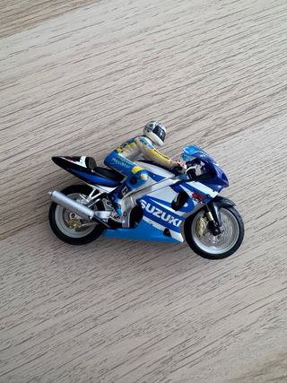 Réplica detallada de la motocicleta Suzuki GSX-R750. - Diseño deportivo en colores azul y blanco. - Incluye figura de piloto con traje de competición.