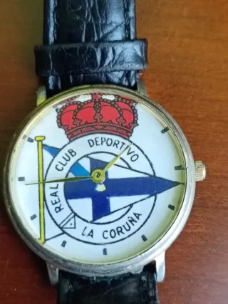 Reloj de pulsera con el escudo del Real Club Deportivo de La Coruña. Funcionando - Esfera blanca con el escudo. - Corona roja. - Correa de piel negra.