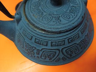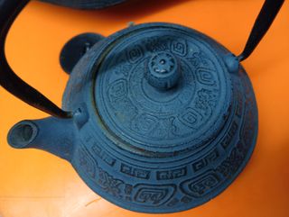 Tetera decorativa con un diseño inspirado en la estética japonesa. Su acabado le da un toque único. - Material: Hierro fundido. - Color: Azul oscuro. - Diseño intrincado en la tapa y el cuerpo.