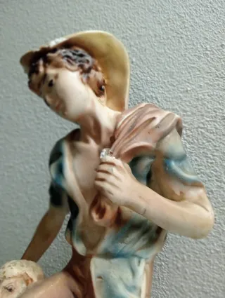 Conjunto de dos figuras decorativas de un pastor y una pastora, datadas de los años 60. - Diseño clásico. - Base decorativa.de gran tamaño ,con el paso del tiempo tienen desgastes y alguna zonas más afectadas,se muestra en las fotos ,habría que retocar ,peso de 2 kl cada figura.las 2 Figueras 15 euros