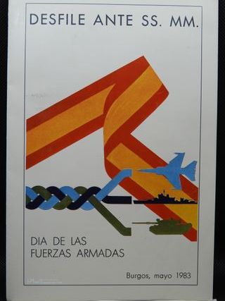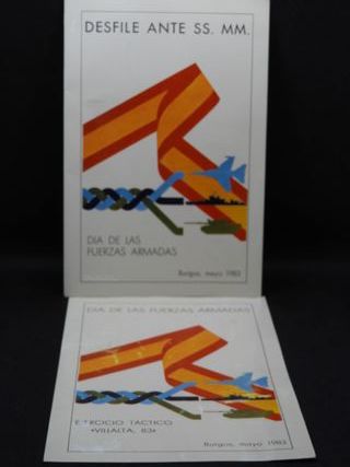 📌 Lote de dos panfletos originales del Día de las Fuerzas Armadas en Burgos, mayo de 1983. Incluyen programa del desfile ante SS. MM. los Reyes y exhibición de instrucción del Ejército de Tierra y Aire. Impresos en color, 14×21 cm, con escudo de la I Región Militar en el reverso. 💬 Se pueden combinar pedidos. No se aceptan devoluciones. Contáctame para más información. ¡Estoy encantado de ayudarte!