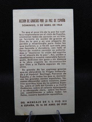 Estampa “Acción de Gracias por la Paz de España” (1964) Cartulina impresa a una tinta con motivo conmemorativo religioso. Ilustración de Virgen con Niño en el anverso y texto de Pío XII al reverso. Medidas aproximadas 10,5 × 6 cm. Pieza histórica y gráfica de los años 60. Documento religioso conmemorativo del 25.º aniversario del fin de la Guerra Civil, distribuido en parroquias e instituciones católicas. Excelente testimonio gráfico del discurso devocional y patriótico del tardofranquismo. 💬 Se pueden combinar pedidos. No se aceptan devoluciones. Contáctame para más información. ¡Estoy encantado de ayudarte!