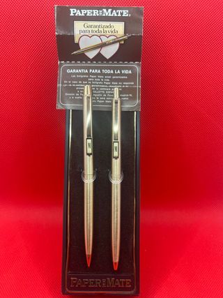 Juego de bolígrafo y portaminas Papermate chapados en oro, en estuche plegable. El portaminas funciona y tiene recambios en el interior y una goma en su punta interior. El bolígrafo escribe perfectamente. Cada uno mide 14 cm. Se pueden combinar pedidos. No se aceptan devoluciones. Contáctame para más información. ¡Estoy encantado de ayudarte!