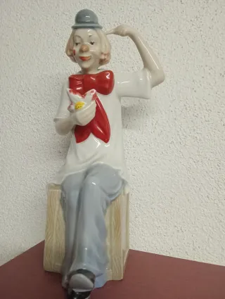 Figura decorativa de un payaso sentado, fabricada en porcelana. - Detalle de flor en la mano. - Sombrero gris y pajarita roja. - Pantalones grises.