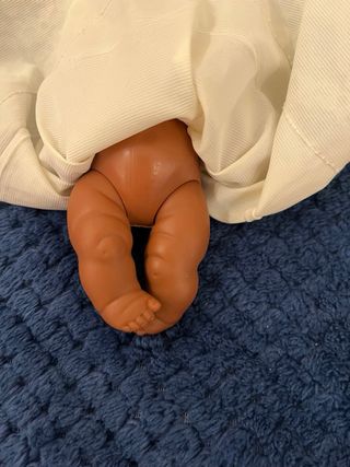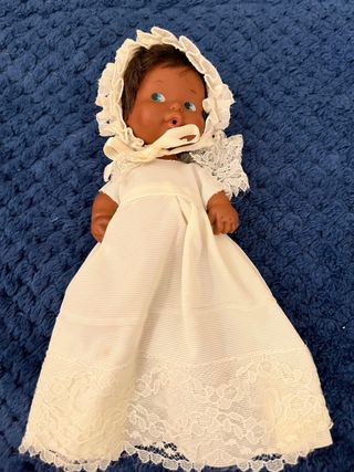 Muñeca Barriguitas de los años 70, con su vestido blanco y capota. - Vestido blanco con detalles de encaje. - Capota de encaje. - Pelo oscuro y ojos azules.