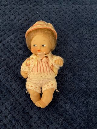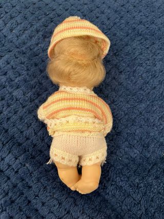 Muñeca Barriguitas de los años 70, con su ropa original. - Vestido de punto rosa y blanco. - Gorrito a juego. - Chaquetita de punto. - Pantalón corto de punto.
