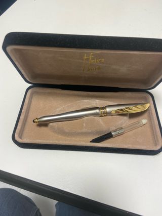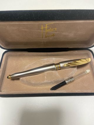 Elegante pluma estilográfica Helio Ferretti, presentada en su estuche original. - Diseño en metal plateado y detalles dorados. - Incluye deposito de tinta. esta sin estrenar fue un regalo que nunca se uso.