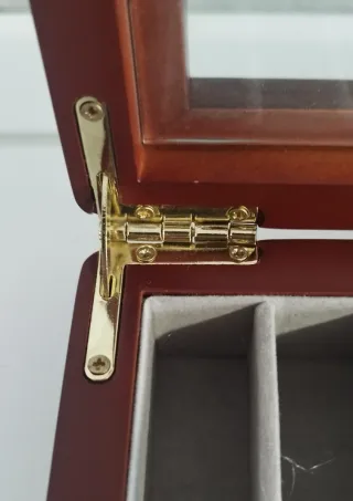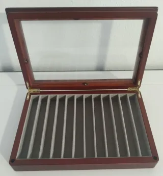Elegante vitrina expositora con compartimentos. - Estructura de madera oscura. - Tapa de cristal. - Interior forrado en fieltro gris. - Múltiples divisiones para objetos pequeños.