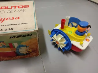 Juguete clásico de Jyesa, el Carlitos Lobo de Mar.con su caja y cartones interiores originales, ref 236, no probado - Barco de juguete con figura de capitán. - Diseño de barco de vapor con ruedas laterales. - Colores vivos: rojo, amarillo y azul.