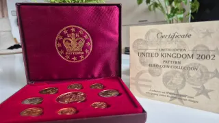 Colección de 9 monedas de patrón del Reino Unido de 2002. - Incluye monedas de patrón del Euro. - Presentado en una caja de presentación. - Viene con un certificado.